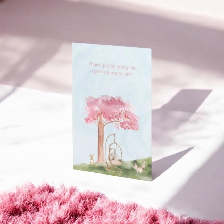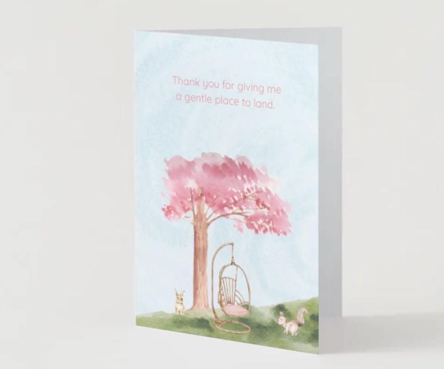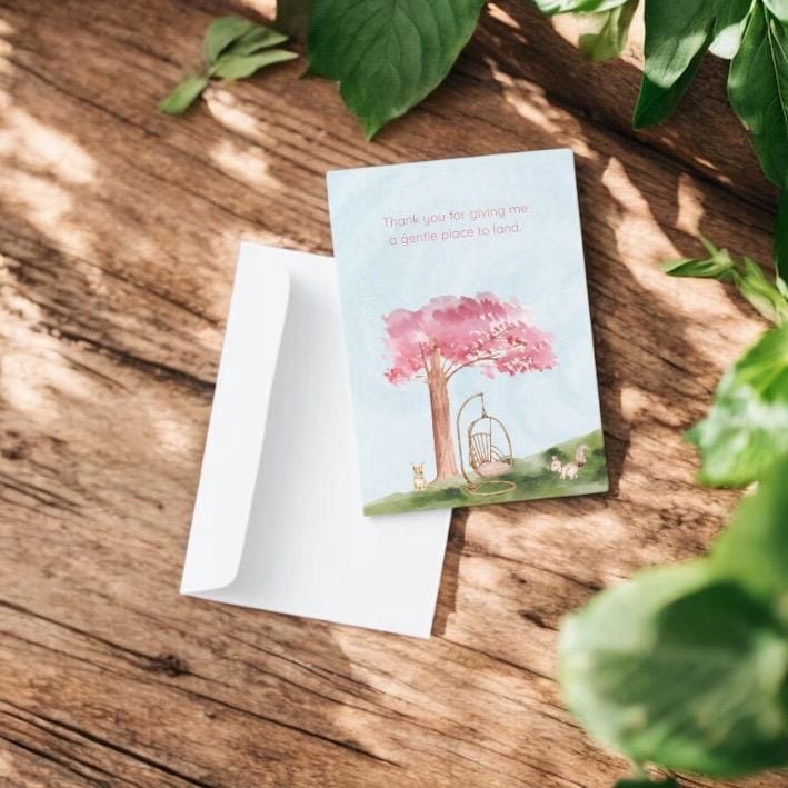 Express heartfelt gratitude with this beautifully designed 5x7 foldable greeting card featuring a serene, peaceful scene and the tender words: “Thank you for giving me a gentle place to land.”