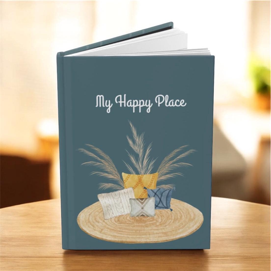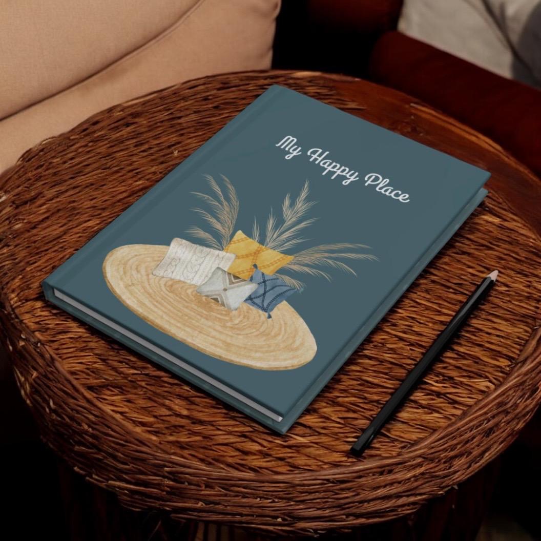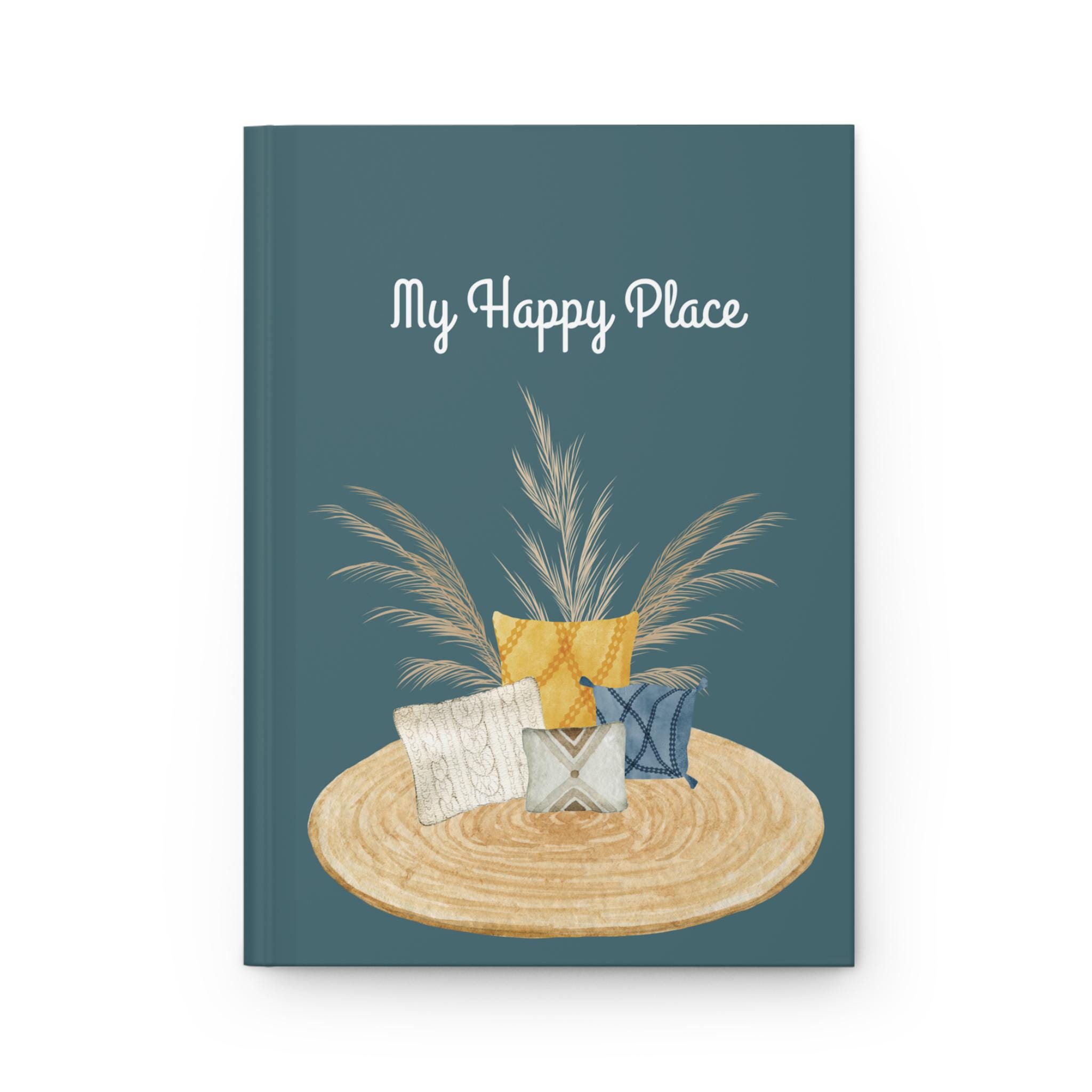 This hardcover matte journal invites quiet moments and simple comforts. The soft teal cover features a woven rug, pampas grass, and a cluster of cozy pillows beneath the handwritten heading “My Happy Place.” Inside, 150 lined pages lie flat thanks to sewn casewrap binding, making it easy to jot morning pages, plan cozy home projects, or capture fleeting ideas. The matte laminated finish and full wraparound print give the artwork a calm, tactile quality that suits living-room notebooks, bedside reflections, or slow Sunday to-do lists. A tiny production barcode sits on the back cover — a practical detail that doesn’t interfere with the gentle, homey aesthetic.